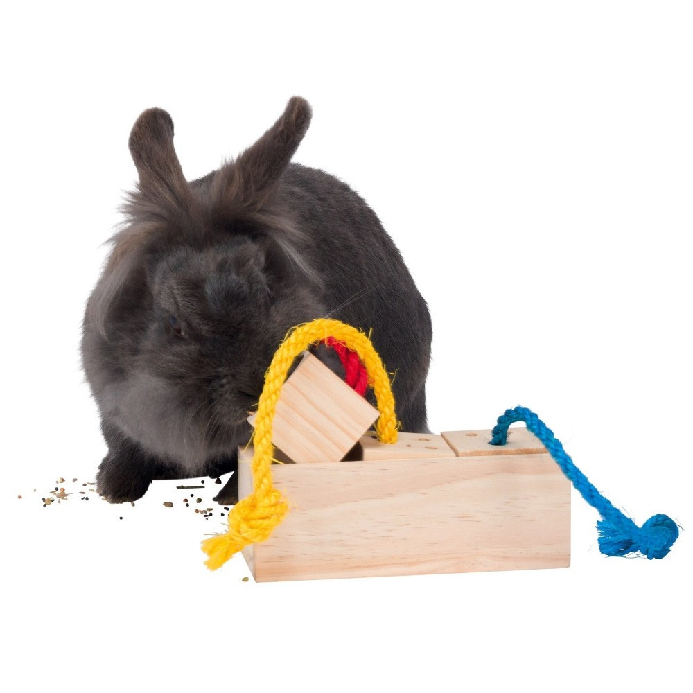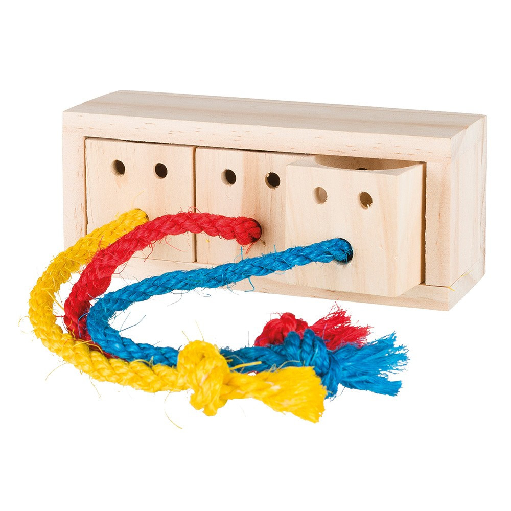 - Para encher com pedaços de fruta e outras guloseimas. - Desafios para obter alimento, são divertidos, desafiam a inteligência do animal ao mesmo tempo que este se exercita - Orificios largos por onde passa os cheiros das guloseimas - 2 níveis de dificuldade em diferentes posições: Nível 1: colocar o brinquedo de lado, para que as cordas fiquem diretamente em frente ao animal, sendo apenas necessário puxá-las. Nível 2: colocar o brinquedo virado para cima, e assim o animal terá de puxar as cordas para cima e levantar o cubo para fora.