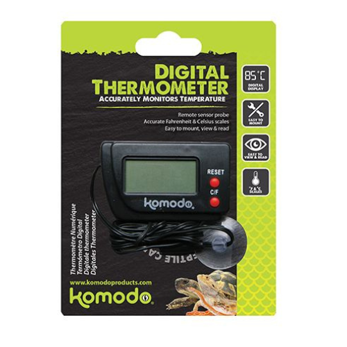 O controlo da temperatura dentro de um terrário é essencial para fornecer a todas as espécies o ambiente correto. O termómetro digital monitoriza com precisão a temperatura e fornece leituras em Fahrenheit e Graus Centígrados, usando uma sonda de sensor remoto flexível.