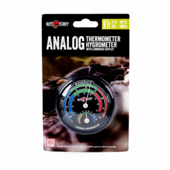 O controlo da temperatura e humidade dentro de um terrário é essencial para fornecer a qualquer espécie de réptil o ambiente correto. O termómetro e higrómetro combinados medem temperatura e humidade e é um medidor duplo, ideal para economia de espaço para um terrário. O mostrador analógico de fácil leitura, com escalas codificadas por cores, mostra Celsius e% RH.