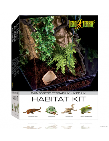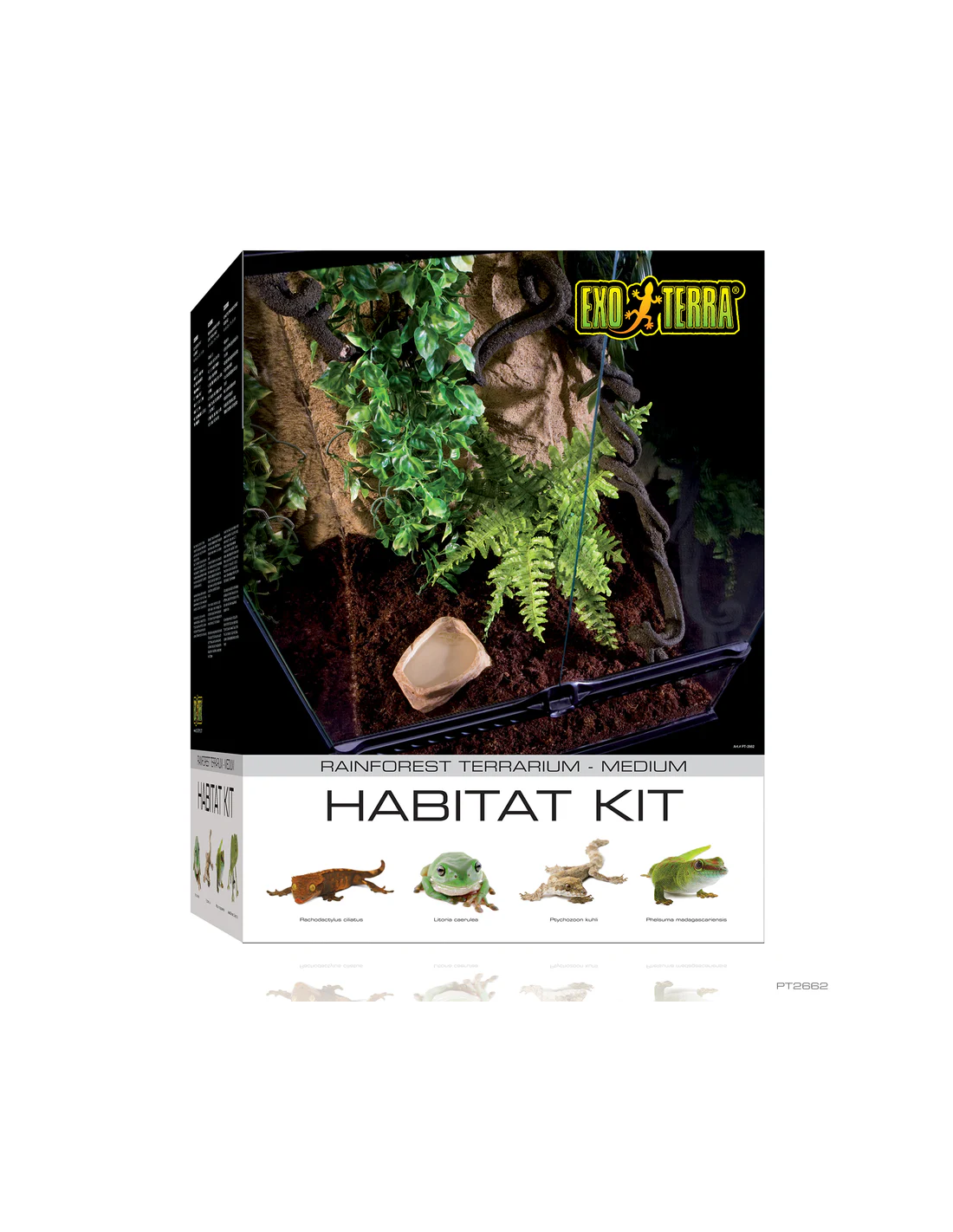 Terrário de Vidro Exo Terra - Tampo Compacto - Higrômetro - Termômetro - Fundo Rochoso - Irrigador Médio - Solo para Plantação - Planta Croton Selva - Planta Amapallo Selva - Trepadeira Selva Pequena - Trepadeira Selva Grande - Samambaia Selva Grande - Manual de Instruções